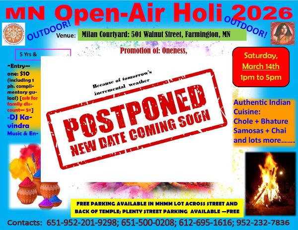 Dear Friends and Lovers of Holi - Festival of Colors: You are cordially invited to participate in MN Open-Air (outdoor) celebrations in Milan Courtyard on Saturday, March 14th, 1pm to 5pm. Please wear your dancing shoes and come dance to Bo