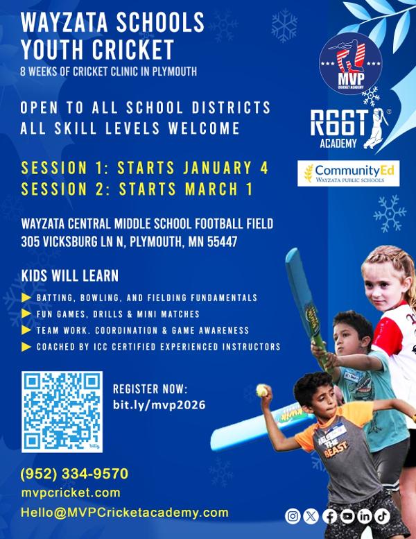 MVP Cricket Academy offers cricket coaching to kids of all ages and skill levels in Plymouth in collaboration with Wayzata Community Ed.  Cricket is a fun bat and ball game, and one of the fastest growing sports in the USA. Learn the skills of this striking and fielding game where you will master principles of batting, bowling (pitching) and fielding in a safe, friendly environment.