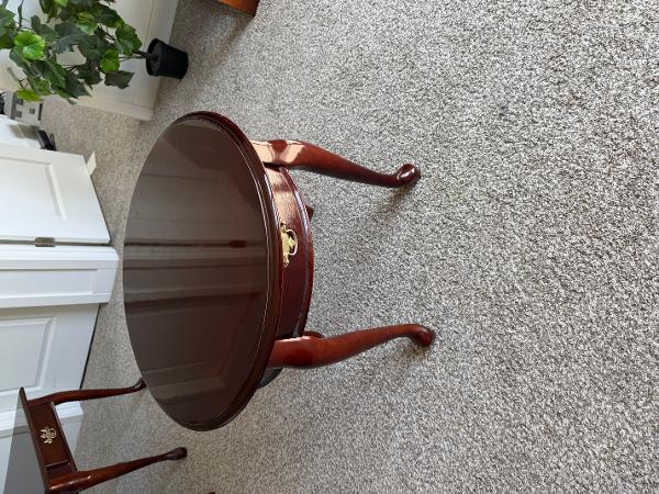 Beautiful solid wood side tables. Has a rich, dark finish. Each table has a drawer with a decorative brass pull. This set includes one square, one rectangular, and one round table. All have classic cabriole legs. Selling each for $50